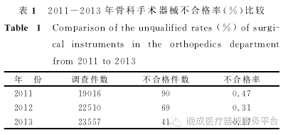 1.1:外來器械管理流程 為確保手術(shù)安全,醫(yī)院建立并實施了骨科外來器械質(zhì)檢員督查制度,調(diào)查骨科外來器械質(zhì)檢員督查制度后,2011-2013年外來器械數(shù)量65?。埃福臣?,比較不合格率。將骨科外來醫(yī)療器械納入了醫(yī)院外來醫(yī)療器械管理流程,實行嚴格的清洗、包裝、滅菌、監(jiān)測、登記和檢查驗收制度。